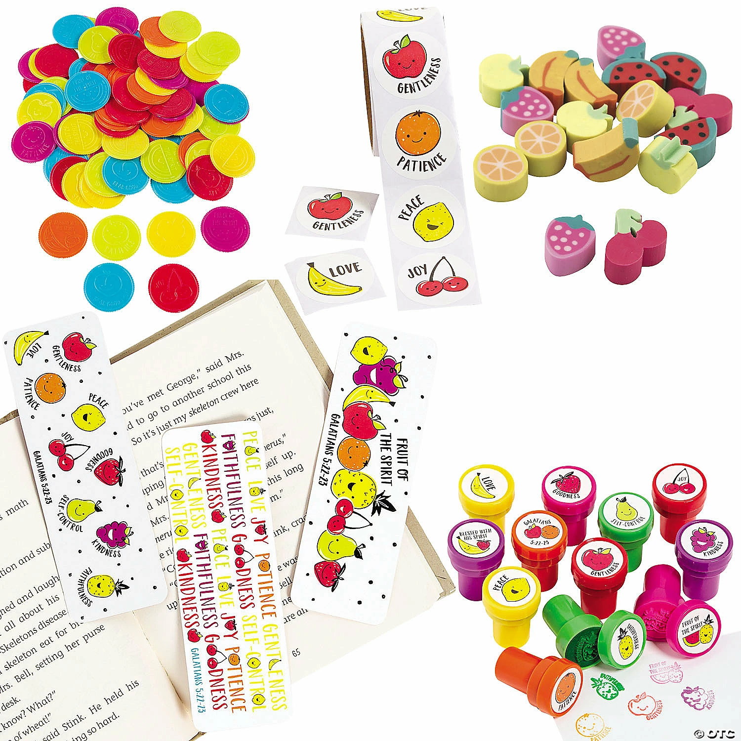Teach kids what it means to live in accord with the Holy Spirit! The colorful goods in this kit show smiling pieces of fruit alongside Bible verses and upstanding characteristics of βGentlenessβ, βJoyβ, βSelf-Controlβ and more. Great for class stations during VBS, as handouts during church meetings or birthday party favors! (640 pcs. per unit)Includes:β’ 48 Cardstock Fruit of the Spirit Bookmarks (2″ x 6″)β’ 300 Rubber Bulk Mini Fruit Erasers (3/4″)β’ 144 Plastic Fruit of the Spirit Coins (1 1/2″)β’ 100 Paper Fruit of the Spirit Scented Stickers (1 1/2″)β’ 48 Plastic Fruit of the Spirit Stampers (1 1/2″ Safe and non-toxic. Conforms to ASTM D-4236.)β’ Assortments are subject to change at any time and may vary from picture shown. Substituted items will be similar in nature.