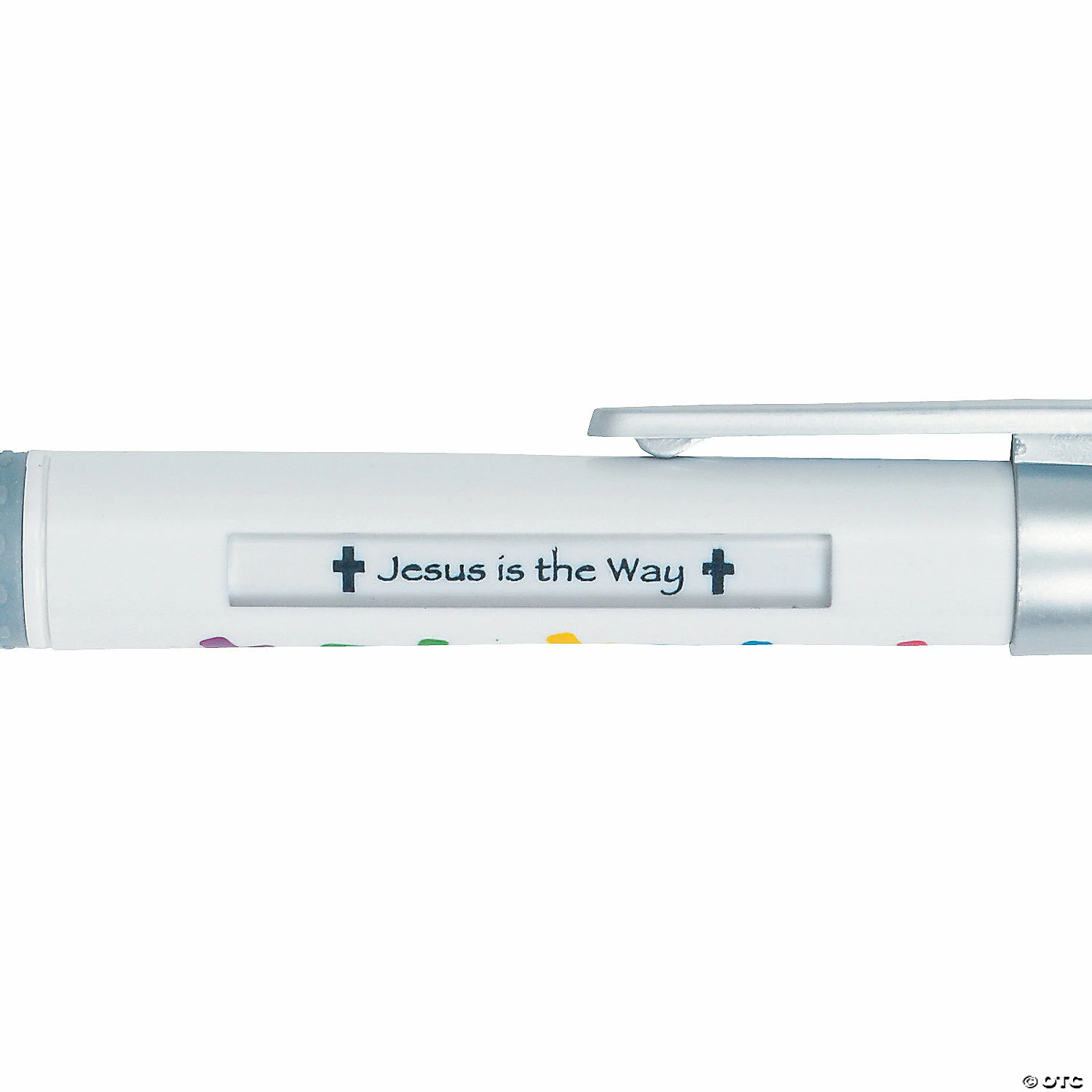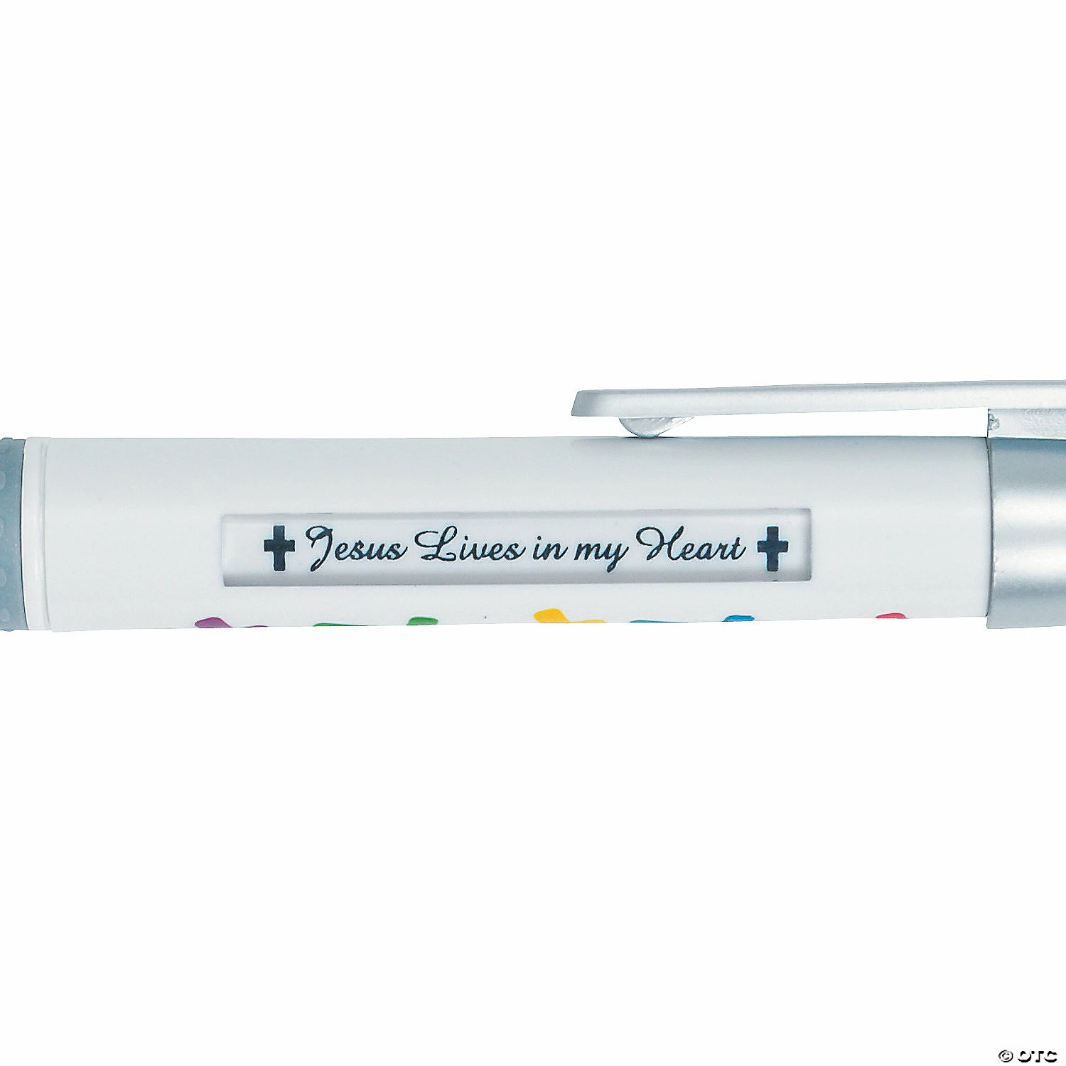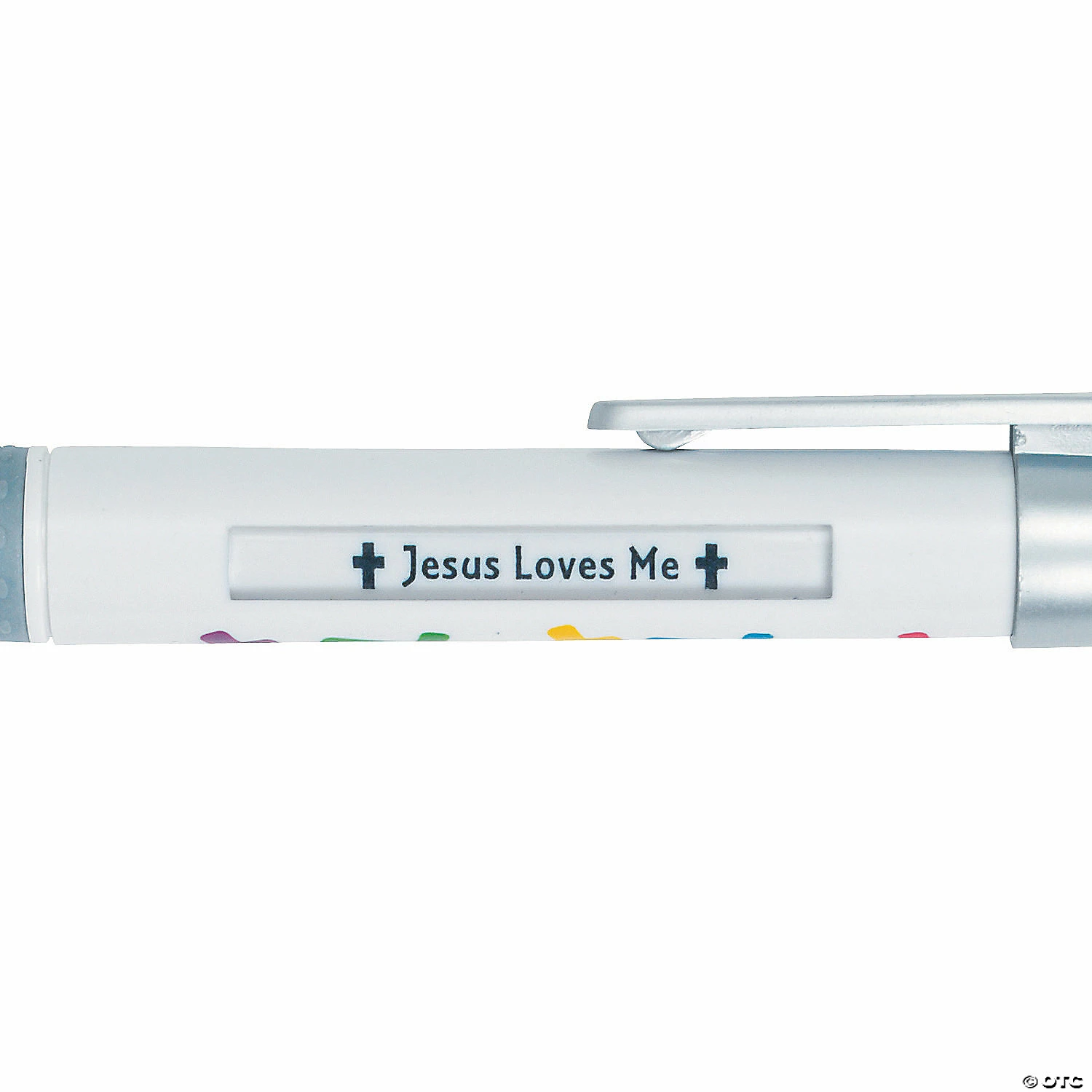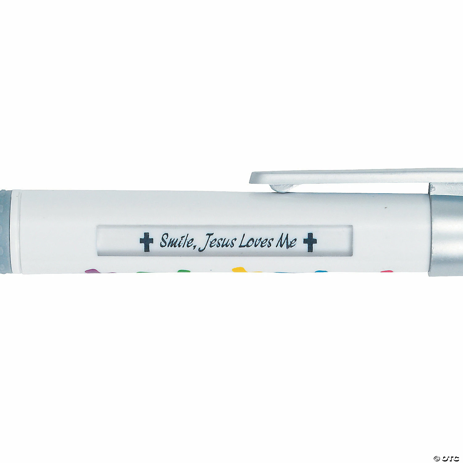 Get a new and inspiring phrase with every click of the pen! Each plastic pen includes 6 assorted messages including βJesus Lives in my Heartβ, βJesus Caresβ, βJesus Loves Meβ, βSmile, Jesus Loves Meβ, βJesus is the Wayβ and βJesus is Loveβ. 5 1/2″ Β© OTC