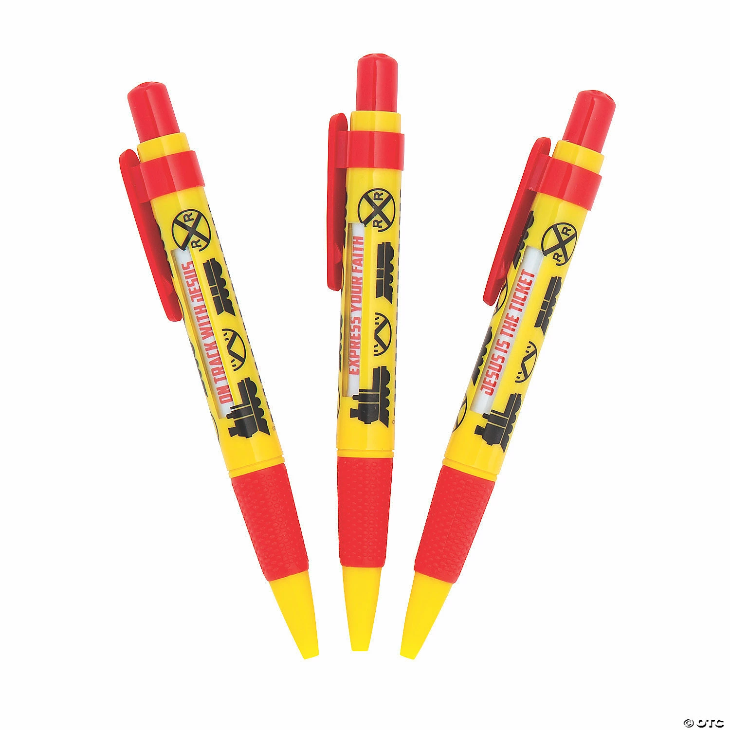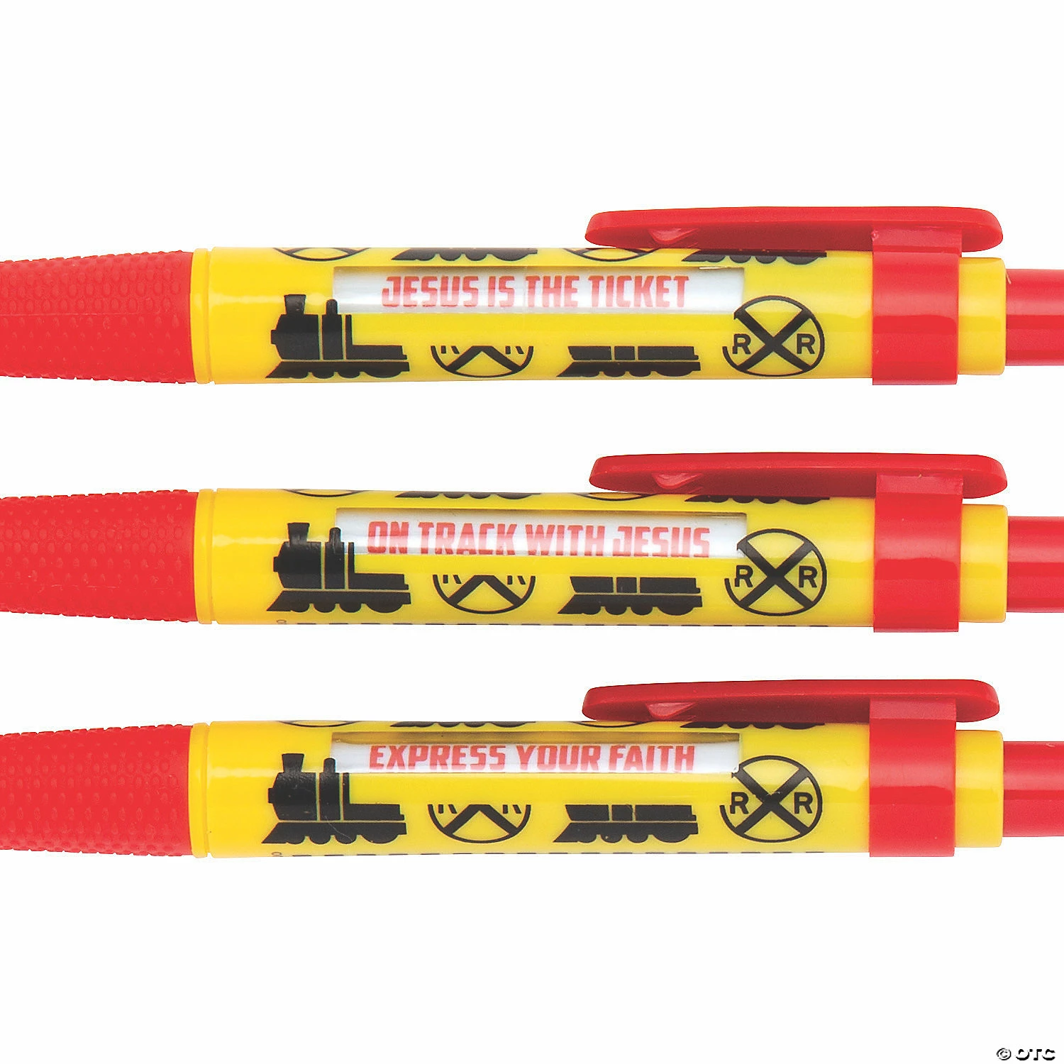 Stay on track with Jesus! Railroad VBS kids will love these cute pens featuring faith-based messages appearing with each click β there are six messages total. A great addition to Railroad VBS curriculum, message pens will be a favorite prize or giveaway among kids and leaders alike. The pens will be in use long after VBS concludes, providing reminders that Jesus is the ticket and to follow His signals. Each pen includes 6 messages. Black ink. Plastic. 5 1/2″ Β© OTC