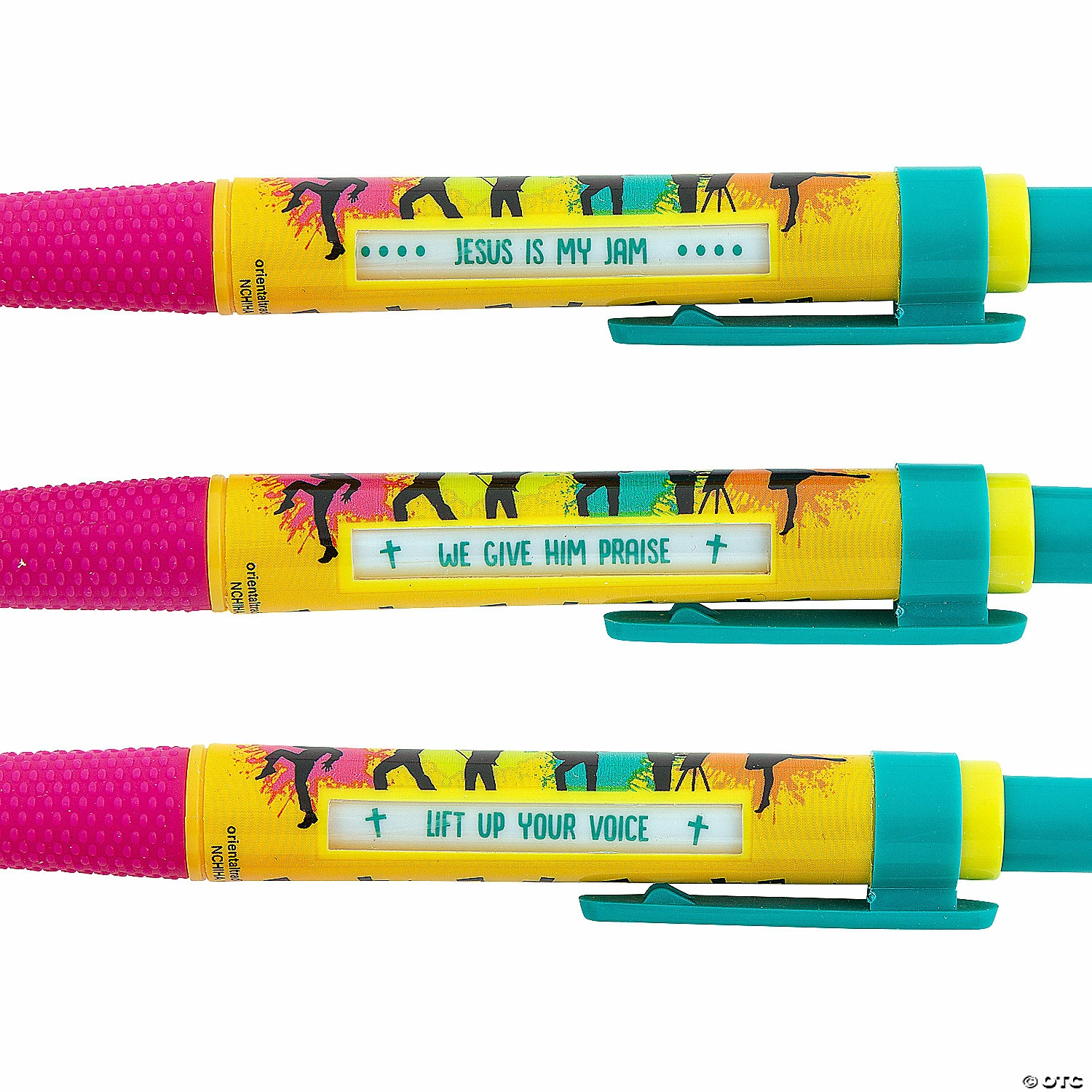 Have these message pens on hand at Studio VBS to use as general supplies or to hand out as VBS prizes and giveaways. Each colorful pen features black ink and revolving messages that appear with a click of the pen. These Studio VBS themed pens are a VBS supply must-have that can be handed out at registration or during the session. Each pen includes 6 messages. Black ink. Plastic. 5 1/2″ Β© OTC